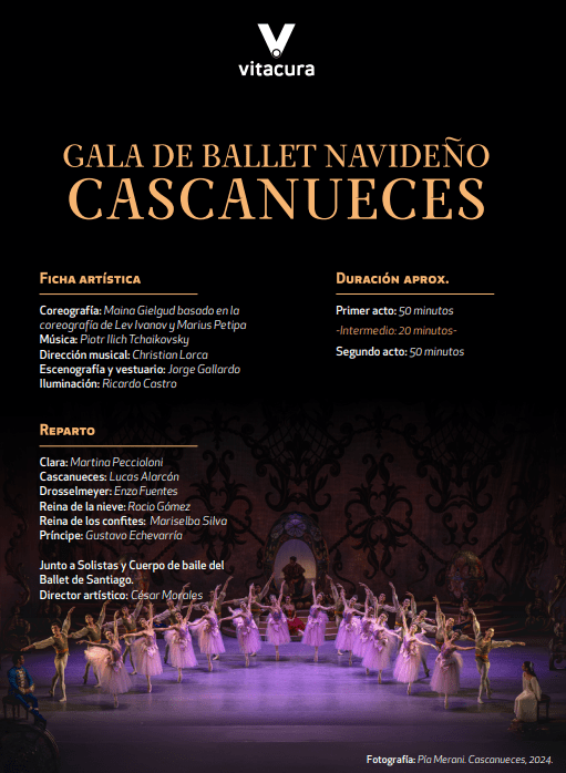 Las puertas del Teatro Municipal de Santiago se abren para recibir nuevamente a los vecinos para la puesta en escena del ballet navideño “Cascanueces”. La obra, que mantiene la esencia de la historia original, será interpretada por los virtuosos artistas del Ballet de Santiago y la Orquesta Filarmónica de Santiago, con música de P. I. Tchaikovsky. La función comienza a las 19:00 horas.