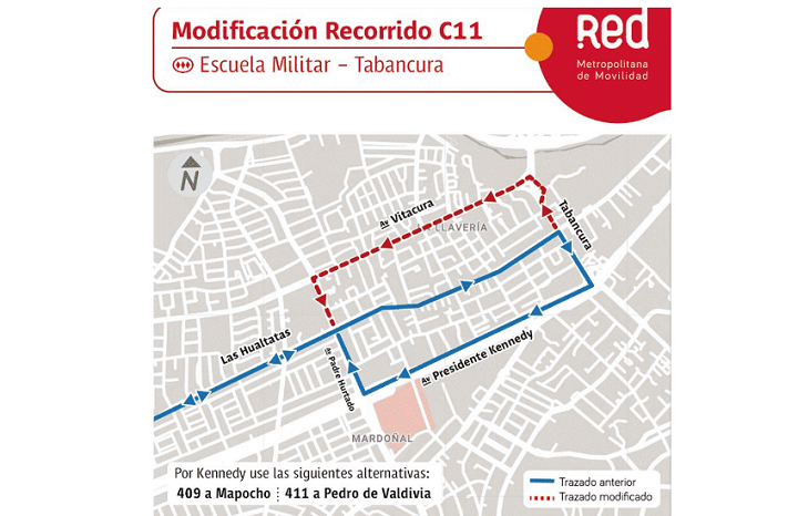 El recorrido C11 modificó su trazado desde Las Hualtatas / Av. Tabancura, donde seguirá hacia Av. Vitacura y luego Av. Padre Hurtado, para seguir con su recorrido habitual por Las Hualtatas hacia Escuela Militar.