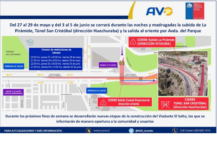 AVO INFORMA CIERRES TEMPORALES DE SUBIDA LA PIRÁMIDE, TÚNEL SAN CRISTÓBAL (DIRECCIÓN HUECHURABA) Y SALIDA AL ORIENTE POR AV. EL PARQUE