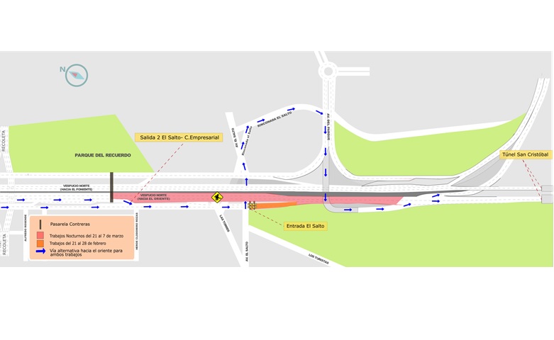Los usuarios que quieran hacer ingreso a Vespucio Norte dirección oriente (tanto desde la caletera, como de Avda. El Salto), tendrán como alternativa la siguiente ruta: Avda. El Salto-Rinconada El Salto-Avda. Del Parque al oriente-Vespucio Norte a Túnel San Cristóbal o subida de La Pirámide.