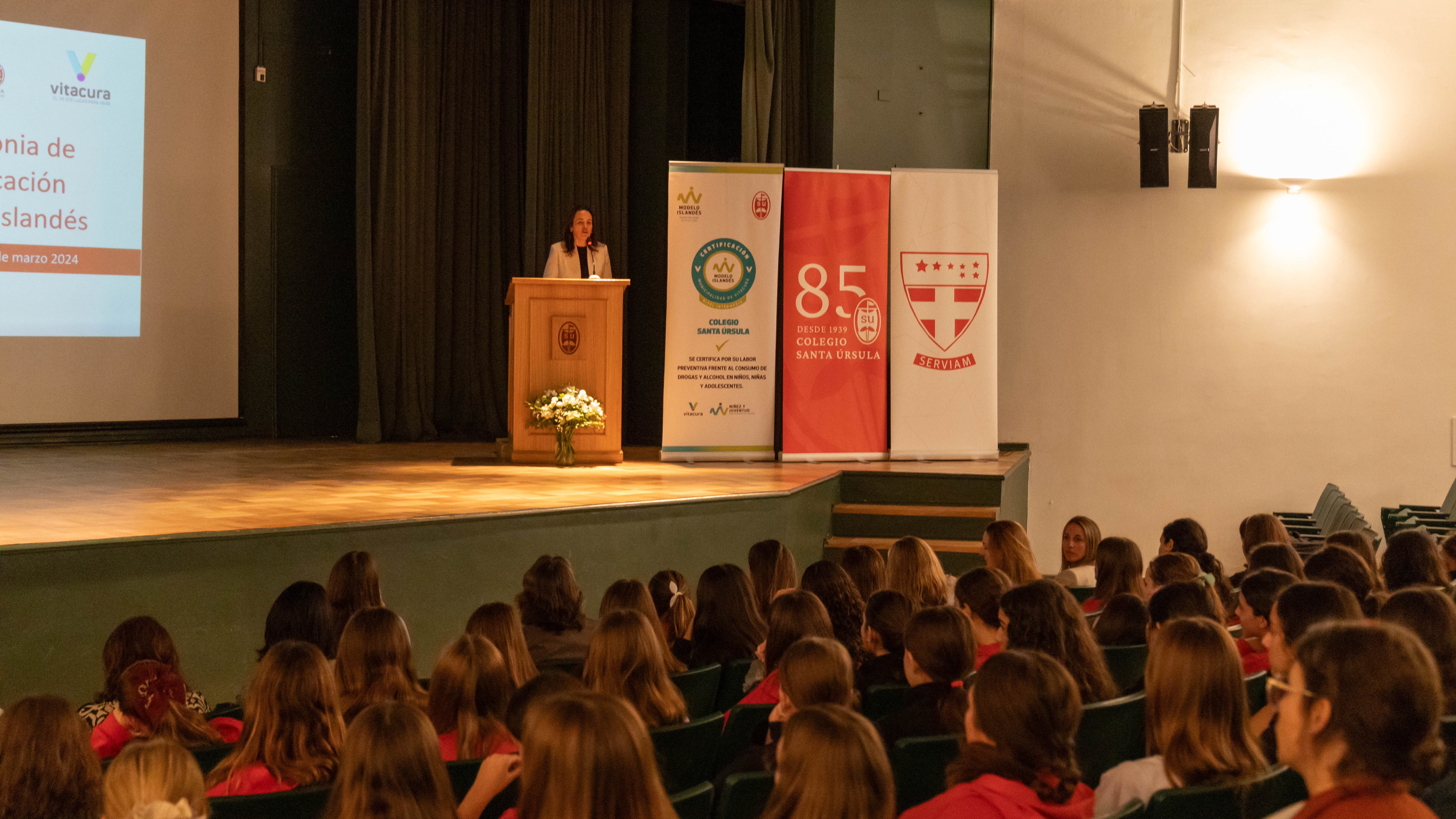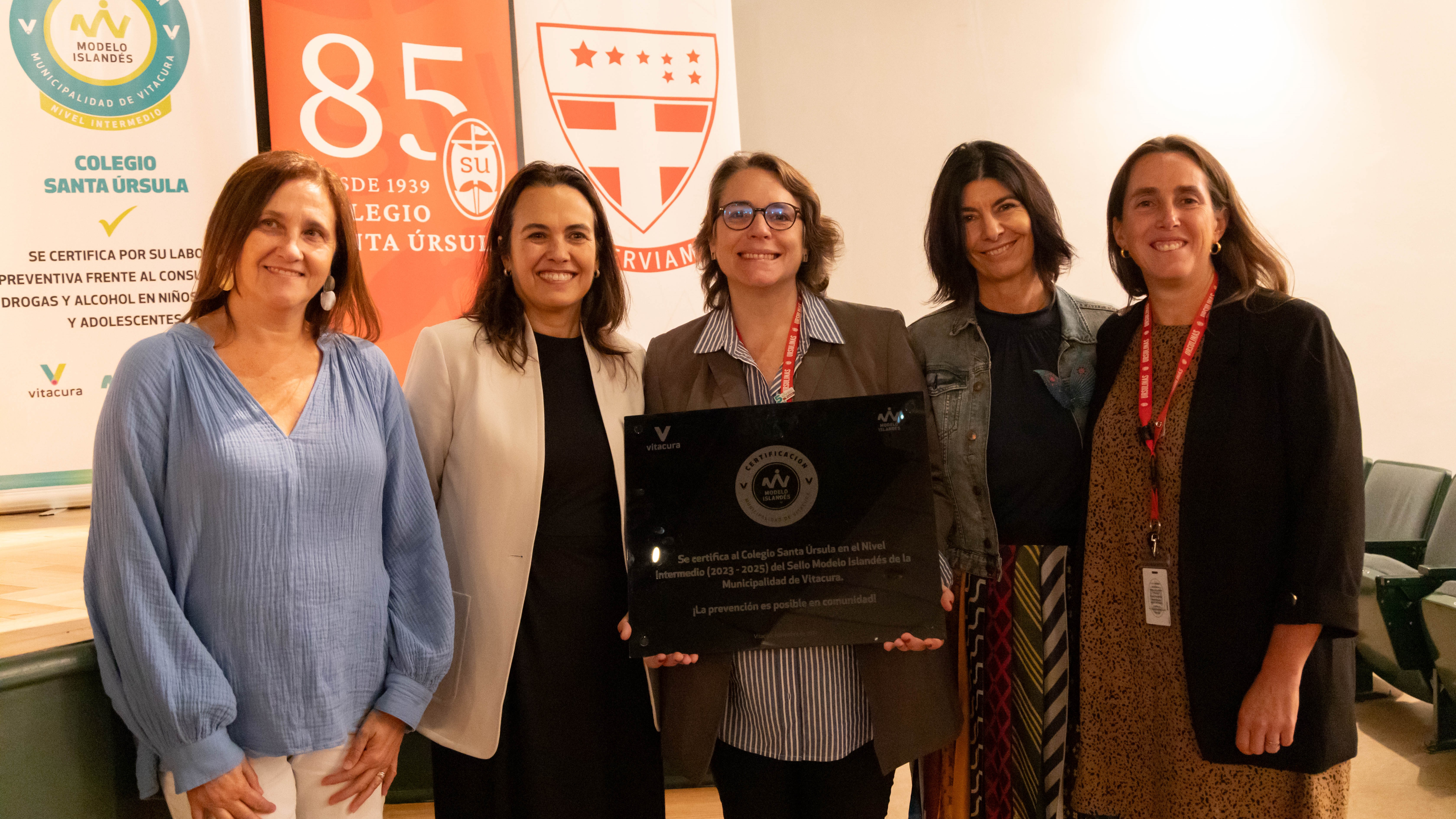 En una ceremonia realizada en el Colegio Santa Úrsula, la Municipalidad de Vitacura hizo entrega de la placa de certificación del Sello Modelo Islandés 2023 en el nivel intermedio. Este reconocimiento premia el compromiso y esfuerzo continuo de la comunidad educativa del colegio en la prevención del consumo de alcohol y drogas entre sus estudiantes.
