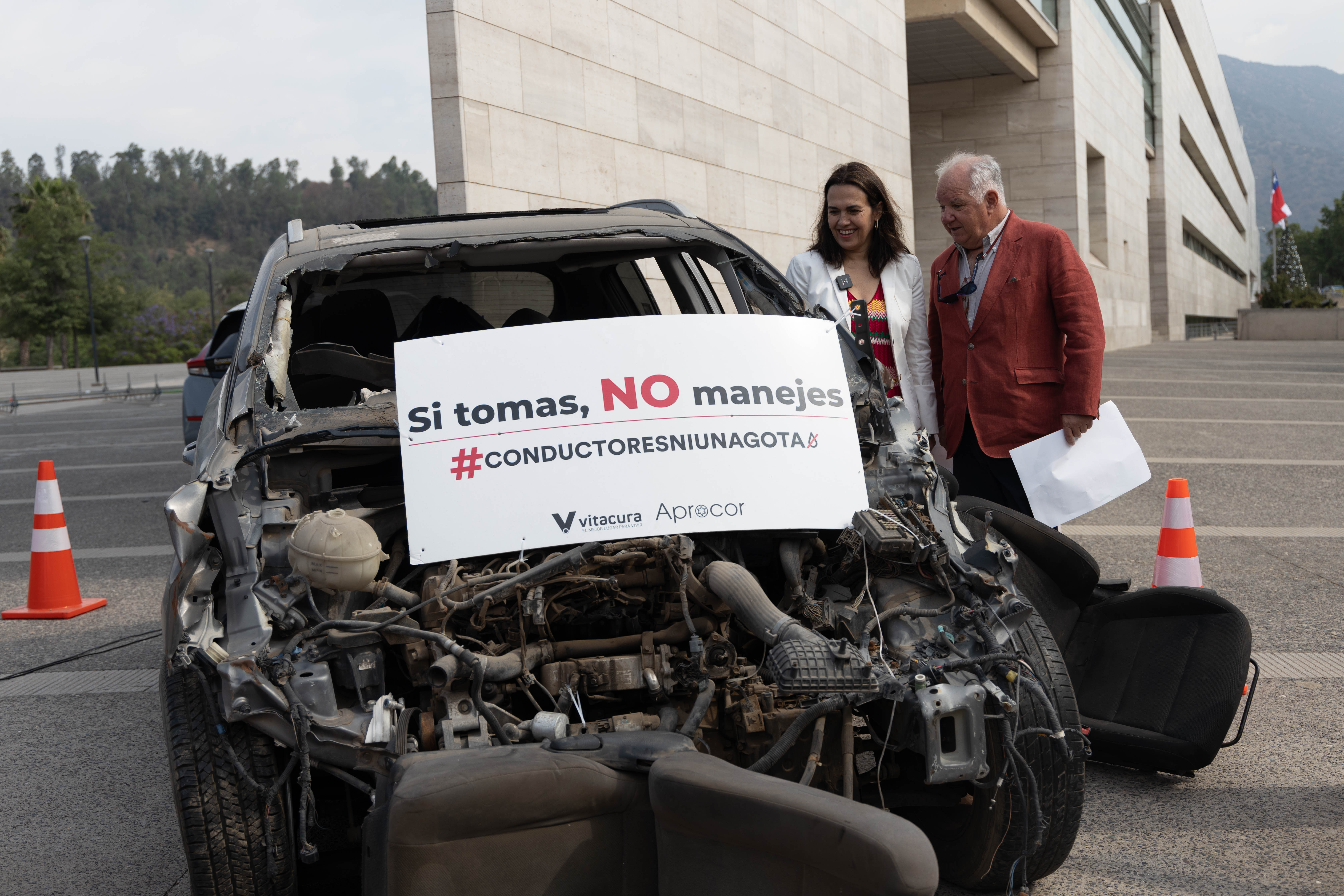 Con autos siniestrados simulando accidentes de tránsito, la alcaldesa de Vitacura, Camila Merino, y la Aprocor, presentaron la campaña #ConductoresNiUnaGota, para evitar accidentes y muertes producto de la conducción irresponsable.