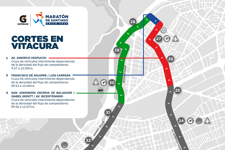 Por último, Av. Bicentenario se cerrará hacia el sur, entre Isabel Montt y Puente Perez Zujovic, lugar desde el cual los deportistas salen de la comuna, hacia el poniente.