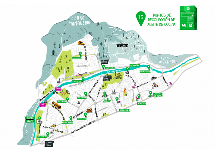 El programa de reciclaje -liderado por la Dirección de Sustentabilidad e Innovación- ha permitido recolectar más de 10 toneladas de aceite desde su lanzamiento en 2018. Para facilitar esa recolección, Vitacura cuenta con kit para los vecinos, que permite convertir cualquier botella plástica PET en un contenedor de aceite de cocina usado.