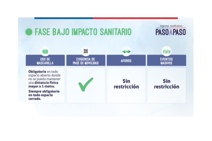 Esta fase es la de menor restricción dentro de las tres etapas centrales del Plan Paso a Paso, también determinada según niveles de presión sobre la red asistencial, la circulación viral y la prevalencia de enfermedad grave y fallecimiento. La vacunación es uno de los indicadores favorables más importantes para llegar a esta instancia.